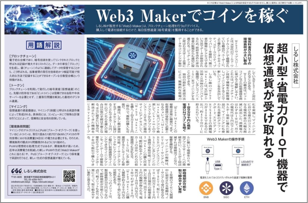 今回、取り上げていただいた記事では、「Web3maker」を超小型・省電力のIot 機器で仮想通貨が受け