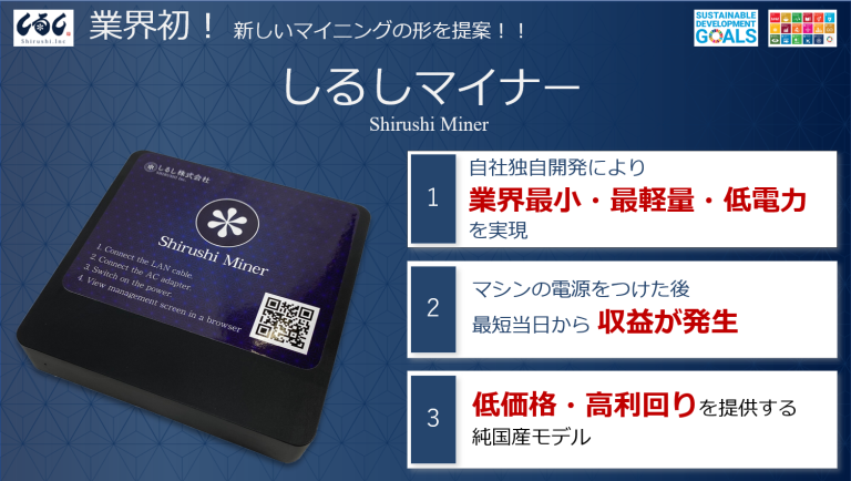 当社は、今までのマイニングマシンで課題となっていた電力消費を抑える為、独自開発により「しるしマイナー」における演算処理を極限までスリム化し、わずか8Wの消費電力でマイニングを行うように設計し、発熱を抑え環境に良い商品の開 … 続きを読む 新たなマイニングの形を提案する「しるしマイナー」提供のお知らせ!